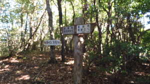 10/10(金) P(07:23)→林道入口(07:26、456m)→八方ケ岳登山口(07:33、487m)→梯子@(07:50)→2.1q(07:57)→岩下神社(08:03)→炭釜(08:08)→穴川分岐(08:27〜08:40、808m)→展望地(08:48)→梯子A(08:55)→0.7q(09:06)→雷の木(09:06)→0.4q(09:18)→班蛇分岐(09:18、1,030m)→八方ケ岳(09:31〜09:52、1,051.9m)→蟹足岳分岐(09:56)→前岳(10:08、1,025m)→1.5q(10:19)→819P(11:21)→蟹足岳(11:28)→梯子B(11:28)→蟹のハサミ岩(11:33、765m)→蟹足岳登山口(12:08、621m)→八方ケ岳登山口(12:49、487m)→林道入口(12:55、456m)→P(13:02)